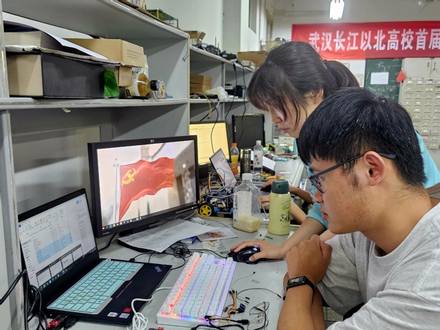 “38度的高温考验不了我们100度的科研热情!”在江汉大学人工智能学院电工电子实验室,学生们在专业老师的指导下,紧张认真地测试手中的单片机。