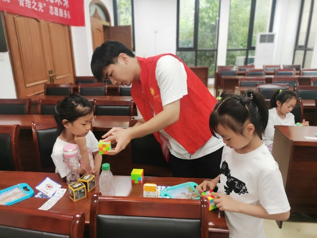 “刚刚我们一起了解并学习了迷你数独,哪位小朋友愿意向大家分享学习心得,在小黑板上画一画。”在志愿者的引导和提示下,小朋友们纷纷举手,跃跃欲试。“很棒,解题又快又正确,给你画上一颗奖励的小星星。”现场教学中,志愿者们耐心教导、适时鼓励,轻声细语地为小朋友们进行讲解和指导。小朋友们积极参与,在数字华容道游戏中,小手不停地移动着棋子,大脑飞速运转,每一次棋子的成功移动都让他们拍手欢呼;当魔方在他们手上从最初的生疏到逐渐熟练,小朋友们脸上洋溢着收获知识的喜悦和满足。