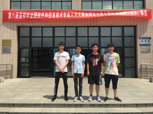 2017年5月26日至5月28日,历时8个月的第八届蓝桥杯全国软件和信息技术专业人才大赛全国总决赛暨颁奖典礼在北京大学圆满结束。我校数计学院的四名学生,在数计学院专业指导教师团队的带领下,参加了北京全国总决赛,并最终荣获C/C++语言程序设计本科A组1个全国三等奖(13级冀磊),C/C++语言程序设计本科B组1个全国二等奖(14级陈捷)、1个全国三等奖(16级朱颖)和1个全国优秀奖(15级戚茂林)的骄人成绩,再次为我校赢得了荣誉。