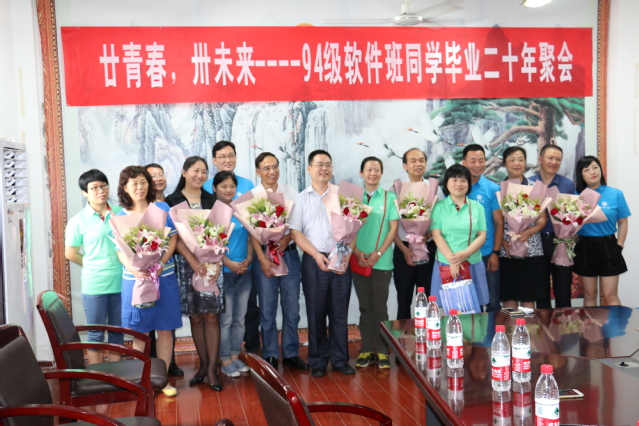 2017年7月1日,数学与计算机科学学院1994级软件班20余名校友重聚母校,举办了以“廿未来,卅青春”为主题的同学会活动。数计学院原党委书记王小净、党委书记周汉平、常务副院长程辉、副院长韩海、专业老师陆迟、王琳艳、杨冬梅参加了本次聚会。活动由班级的杜鹃同学主持。