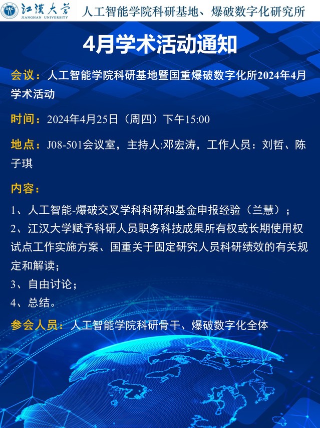 为加强英国正版365首页官网、爆破数字化研究所科研人员间的交流学习,促进不同研究方向间的交叉融合,2024年4月25日下午15点在人工智能科研基地(J08-501会议室)进行了英国正版365首页官网科研基地暨国重爆破数字化所2024年度4月份科研活动。