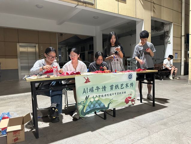 J05中庭,同学们围坐在一起,认真学习剪纸技艺,积极发挥想象力,别出心裁地创作出了一系列富有创意和个性的剪纸作品。一把把刻刀灵活转动,一幅幅与端午传统文化相关、形象逼真、生动有趣的剪纸作品呈现在大家眼前。同学们在动手学习中感受传统艺术的魅力,每一幅作品都传递出“浓情端午”的深深祝福。