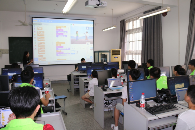 一到校,孩子和家长们就受到了学校相关职能部门老师和学院主要负责人的热情接待,数计学院计科系专业老师给他们演示了各类智能机器人并进行了详细原理讲解,正在学校备战学科竞赛的同学们也现场给孩子们上了一堂生动的少儿编程课,并让每一个孩子亲身体验了电脑编程的过程。孩子们看到我院学生自行组织的机器人后兴致高涨,现场踊跃跟专业老师互动提问。下午,他们来到学院,观看了学校宣传片和2019年武汉市军运会宣传片,学院军运会志愿者还给孩子和家长们介绍了第七届武汉市军运会志愿服务情况,并鼓励孩子们从自己做起,为军运会贡献自己的力量。活动期间,学院志愿者还带领孩子和家长们体验了江大食堂,游览了三角湖、未名山等校园景点。